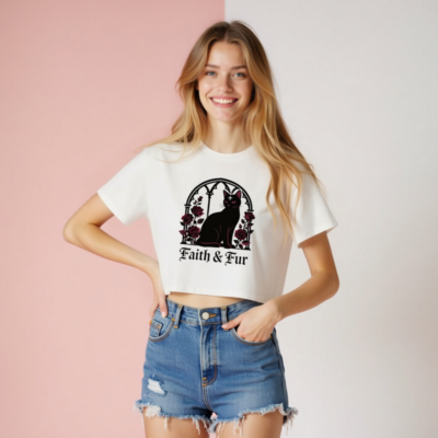 Stylish women’s crop top featuring a gothic black cat with red eyes and a cross, framed by an arched window and deep red roses. Perfect for witchy, alternative, or Halloween fashion lovers. Soft cotton blend, cropped hem, comfortable fit. ‘Faith & Fur’ text adds bold statement. Ideal for layering or wearing solo.
