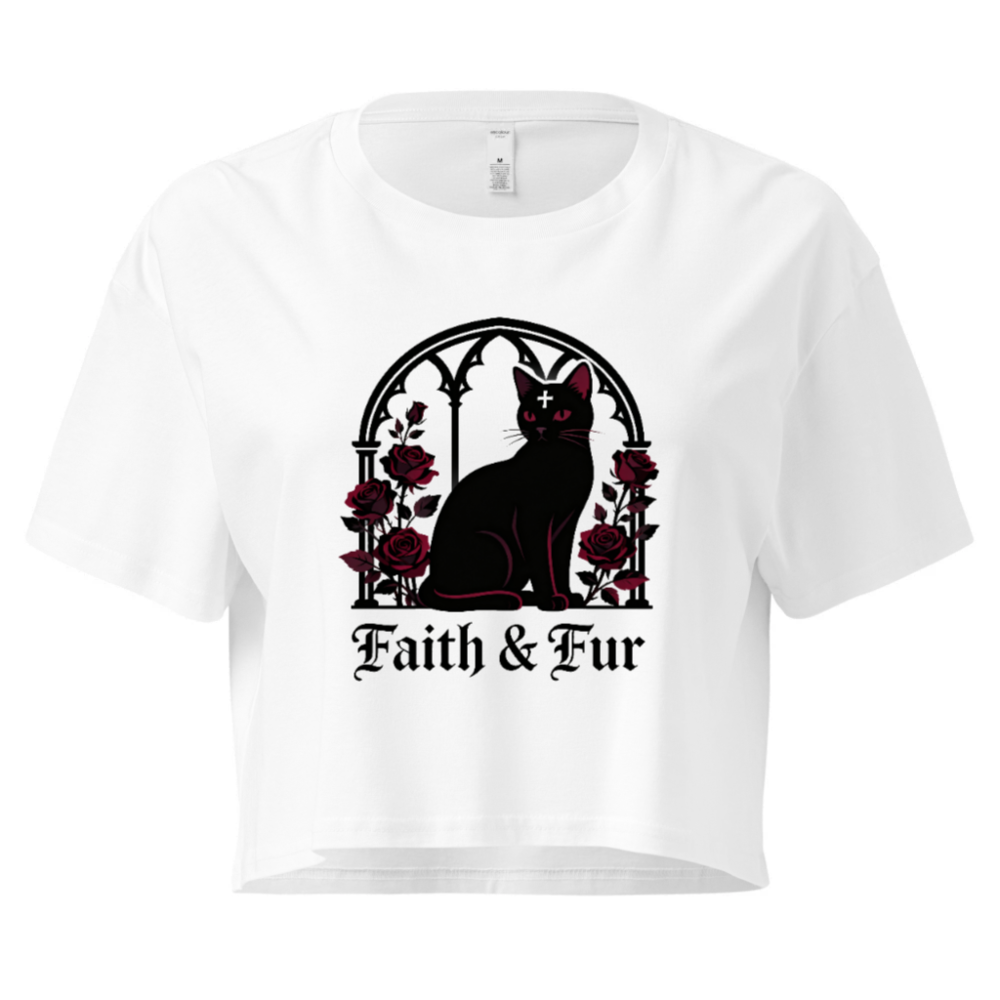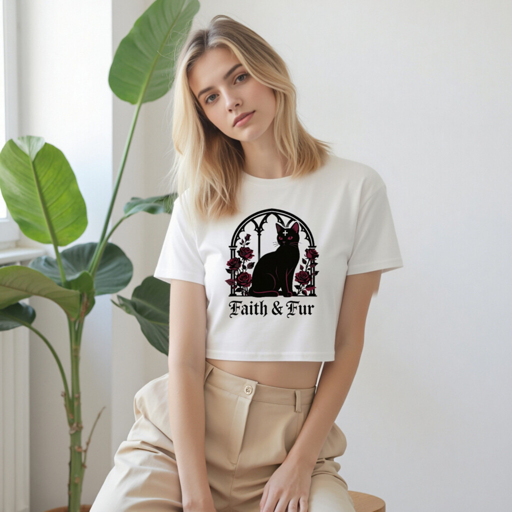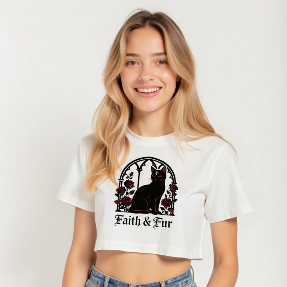 Stylish women’s crop top featuring a gothic black cat with red eyes and a cross, framed by an arched window and deep red roses. Perfect for witchy, alternative, or Halloween fashion lovers. Soft cotton blend, cropped hem, comfortable fit. ‘Faith & Fur’ text adds bold statement. Ideal for layering or wearing solo.