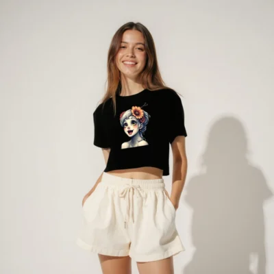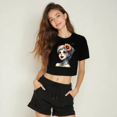 Elegant women’s crop top featuring a charming anime-style girl with gray hair adorned by orange and red flowers. Soft black fabric, relaxed fit, short sleeves—perfect for casual wear or festival style. Designed for comfort and visual appeal with high-quality print. Ideal gift for art lovers.