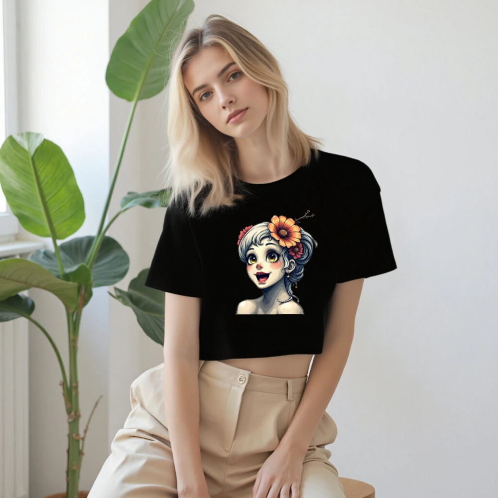 Elegant women’s crop top featuring a charming anime-style girl with gray hair adorned by orange and red flowers. Soft black fabric, relaxed fit, short sleeves—perfect for casual wear or festival style. Designed for comfort and visual appeal with high-quality print. Ideal gift for art lovers.