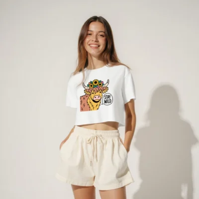 This women’s crop top features a charming illustrated Highland cow adorned with sunflowers and colorful blooms, paired with the playful ‘STAY WILD’ speech bubble. Designed for casual wear, it offers a fun, nature-inspired aesthetic with a relaxed fit. Perfect for fans of whimsical animal prints and boho-chic style. Machine washable for easy care.