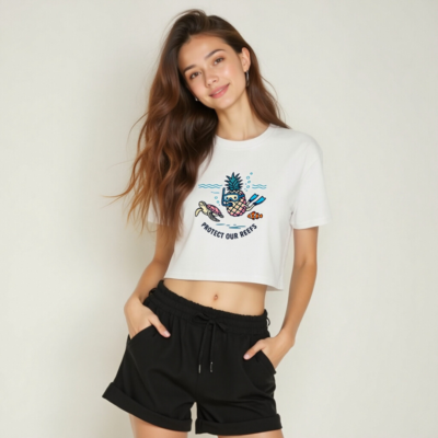 Adorable women’s crop top featuring a playful pineapple wearing snorkeling gear, swimming alongside a sea turtle and clownfish. Soft, comfortable cotton blend. Support ocean conservation—’Protect Our Reefs’ message printed below. Perfect for beach lovers, eco-conscious shoppers, and tropical style fans. Designed for everyday wear with a fun, uplifting vibe.
