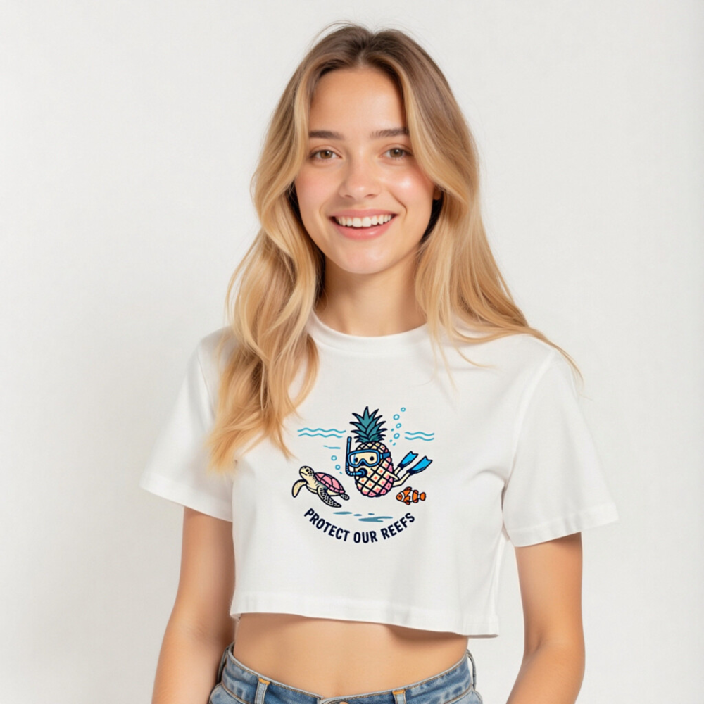 Adorable women’s crop top featuring a playful pineapple wearing snorkeling gear, swimming alongside a sea turtle and clownfish. Soft, comfortable cotton blend. Support ocean conservation—’Protect Our Reefs’ message printed below. Perfect for beach lovers, eco-conscious shoppers, and tropical style fans. Designed for everyday wear with a fun, uplifting vibe.