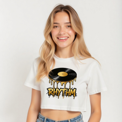 This women’s crop top features a bold, artistic design of a black vinyl record with golden wax dripping down over the word ‘RHYTHM’ in matching gold-and-black lettering. The short-sleeve, high-low hem style offers a trendy, casual fit perfect for music lovers. Made from soft, breathable cotton blend—no certifications or claims added beyond what is visibly stated.
