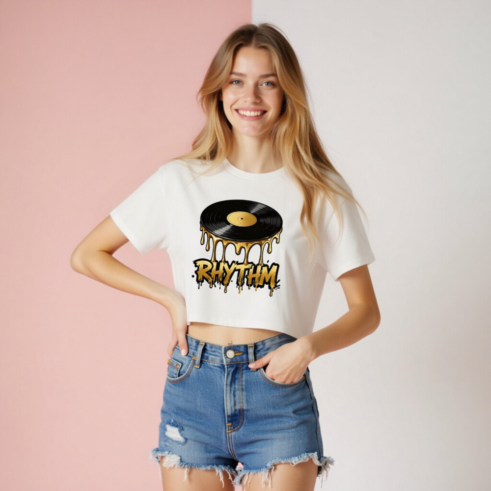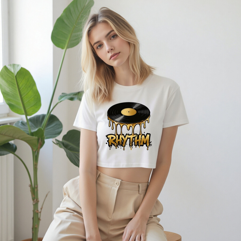 This women’s crop top features a bold, artistic design of a black vinyl record with golden wax dripping down over the word ‘RHYTHM’ in matching gold-and-black lettering. The short-sleeve, high-low hem style offers a trendy, casual fit perfect for music lovers. Made from soft, breathable cotton blend—no certifications or claims added beyond what is visibly stated.