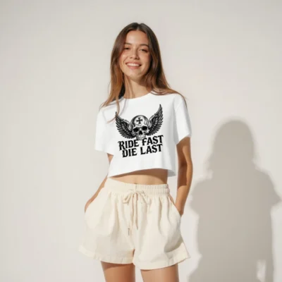 Show your biker spirit with this women’s crop top featuring a bold winged skull graphic topped with a cross, paired with the iconic ‘Ride Fast Die Last’ slogan. Designed for comfort and style, this short-sleeve cropped tee fits true to size and is ideal for motorcycle enthusiasts. Made with quality cotton blend fabric for everyday wear. Perfect for riders, festivals, or casual streetwear.
