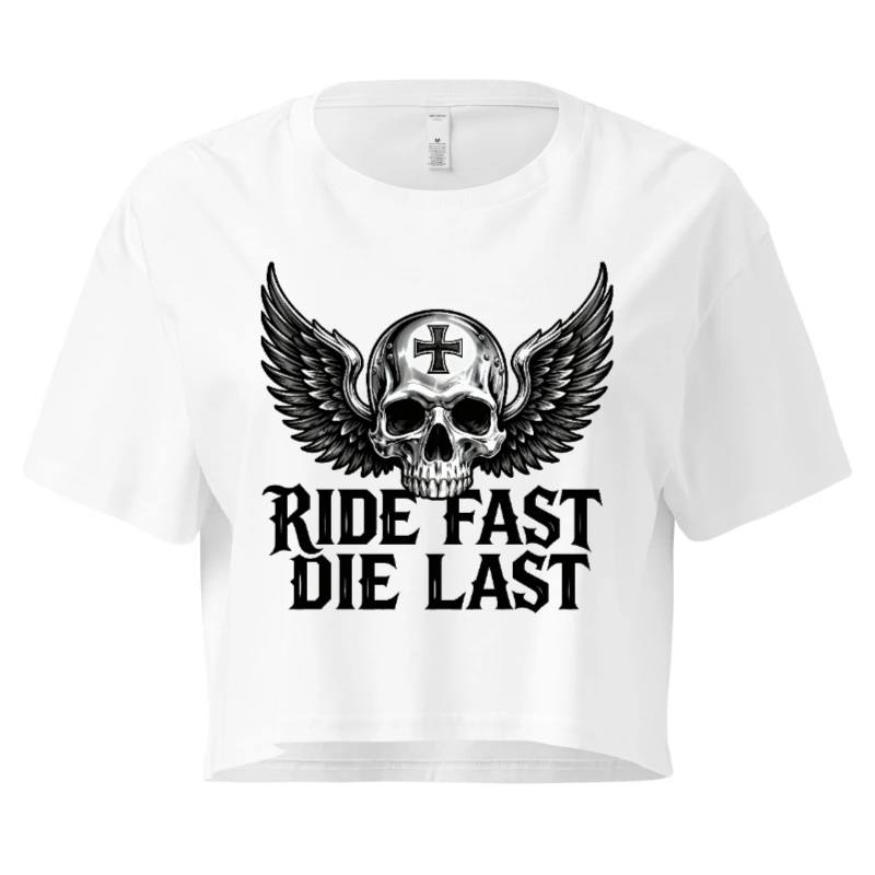 Women’s Crop Top with Winged Skull & Cross Design | Ride Fast Die Last