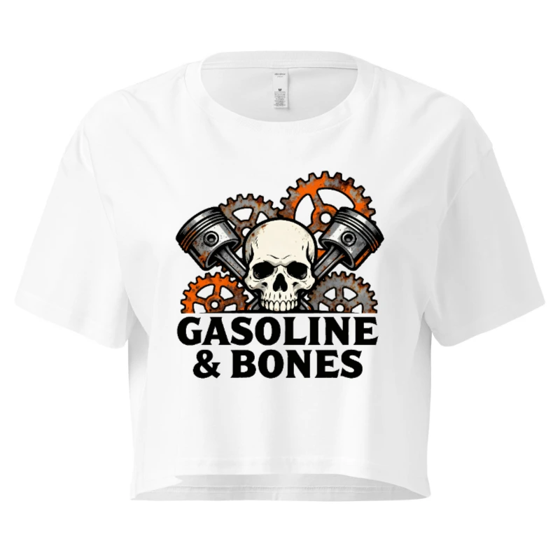 Women’s Gasoline & Bones Crop Top – Skull, Pistons & Gears Motor Theme Tee