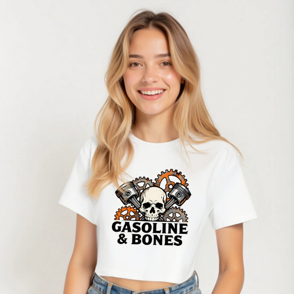 This women’s crop top features a bold ‘Gasoline & Bones’ design with a vintage skull, crossed engine pistons, and rust-finished gears—perfect for car enthusiasts. Made from soft, breathable fabric for everyday wear. Short cropped style pairs well with high-waisted bottoms. Ideal gift for mechanics, auto lovers, or anyone who rocks the biker/rock aesthetic.