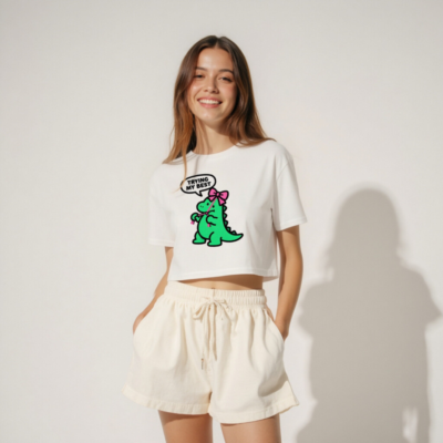 Adorable women’s crop top featuring a playful green dinosaur with a pink bow, holding knitting needles and saying ‘TRYING MY BEST’ in a speech bubble. Soft cotton blend, relaxed fit, short sleeves, cropped hem for trendy casual wear. Perfect for yoga, brunch, or everyday fun. Ideal gift for dinosaur lovers and craft enthusiasts.