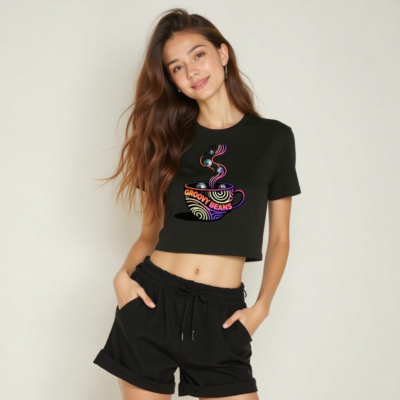 Vibrant women’s crop top featuring a retro disco coffee cup with swirling neon steam and reflective disco balls. ‘Groovy Beans’ text in bold gradient font. Perfect for dance parties, 70s/80s vibes, or casual groovy style. Short hem, relaxed fit, soft cotton blend. Designed for comfort and eye-catching appeal.