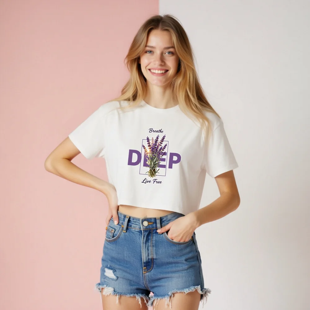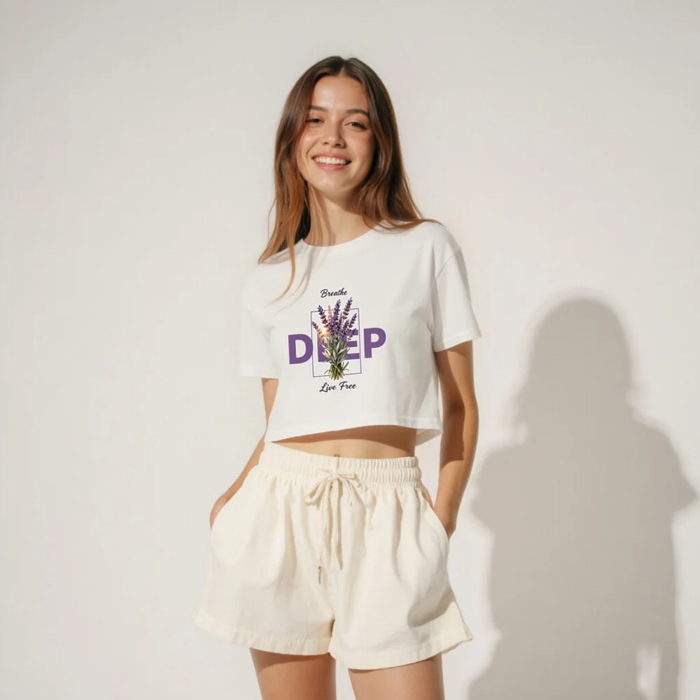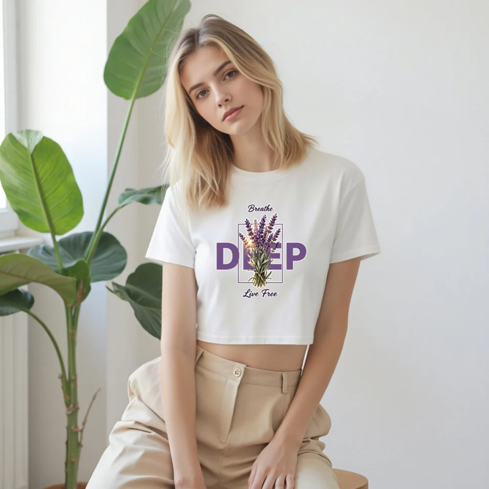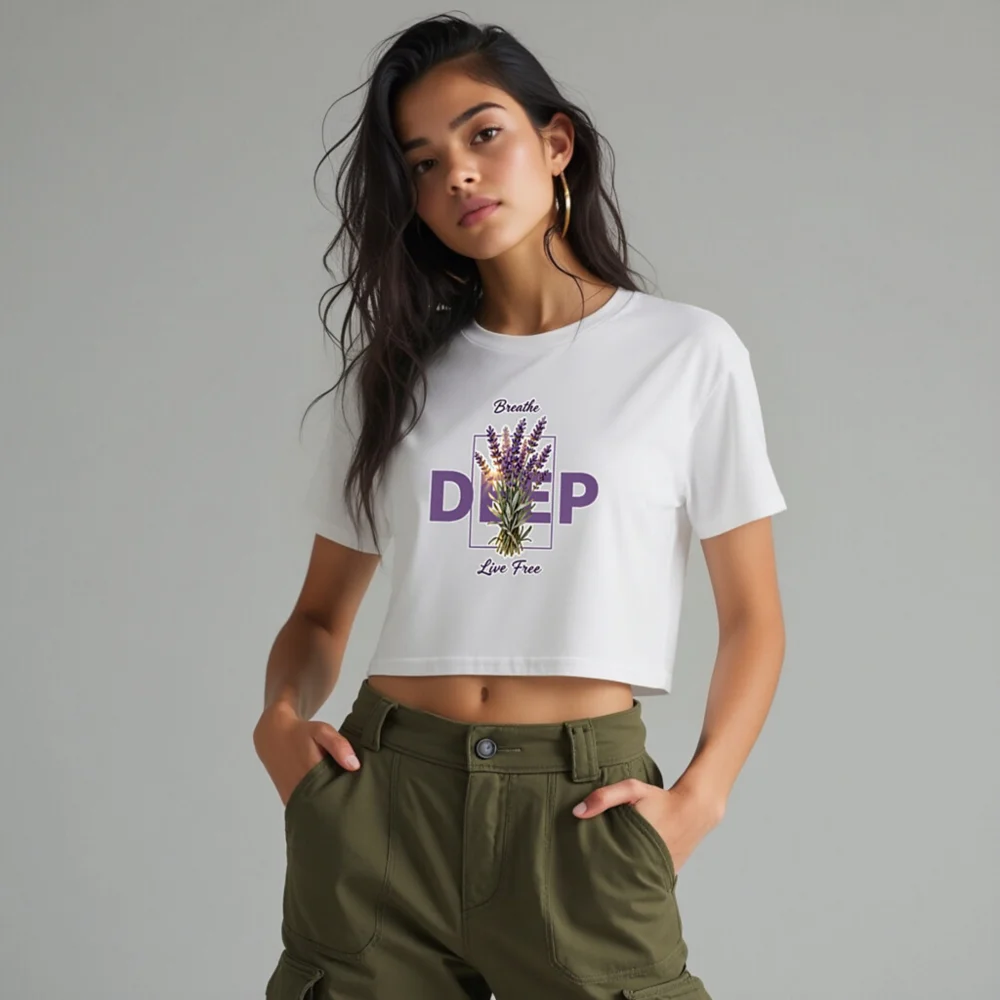 Stylish white cropped t-shirt for women featuring a calming lavender bouquet graphic with the uplifting message ‘Breathe Deep, Live Free’. Made from soft, breathable cotton blend for all-day comfort. Perfect for yoga, casual wear, or layering. Relaxed fit with a flattering cropped hem. Ideal for mindful living, self-care routines, or gifting to someone who values tranquility and freedom. A meaningful, fashion-forward piece that combines aesthetic appeal with positive intention.