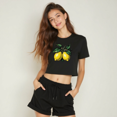 Women’s Lemon Crop Top – Yellow Citrus Graphic Tee, Short Sleeve, Black