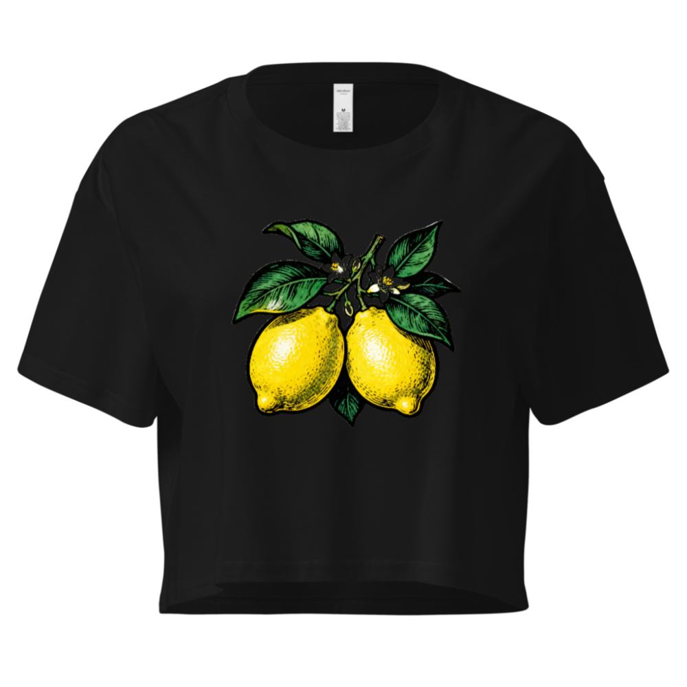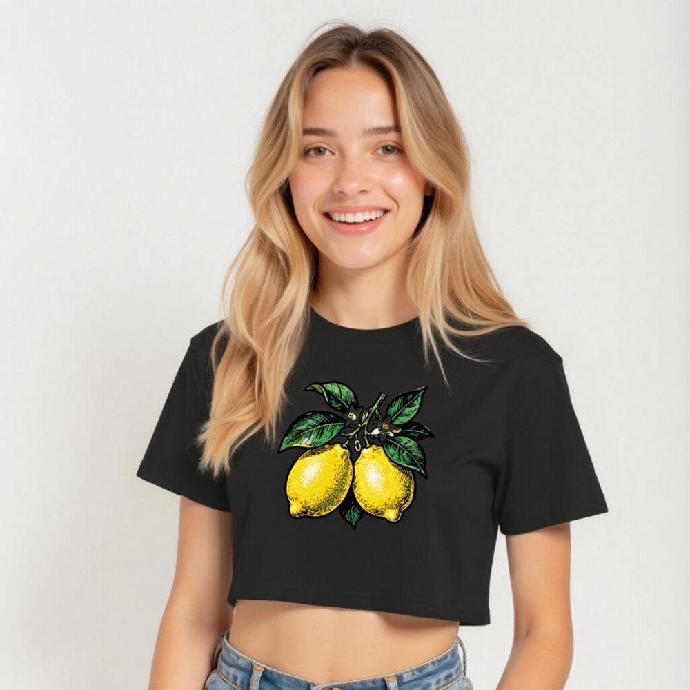 Women’s Lemon Crop Top – Yellow Citrus Graphic Tee, Short Sleeve, Black