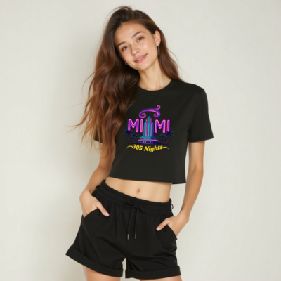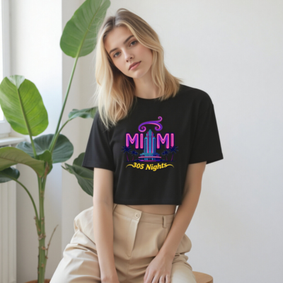 This women’s black crop top features vibrant Miami-themed neon art: ‘MIAMI’ in pink-purple glow with a turquoise Art Deco tower, palm trees, and ‘305 Nights’ in yellow script. Designed for casual wear, it’s a stylish tribute to Miami’s iconic nightlife and tropical vibe—perfect for fans of the city or 80s retro aesthetics.