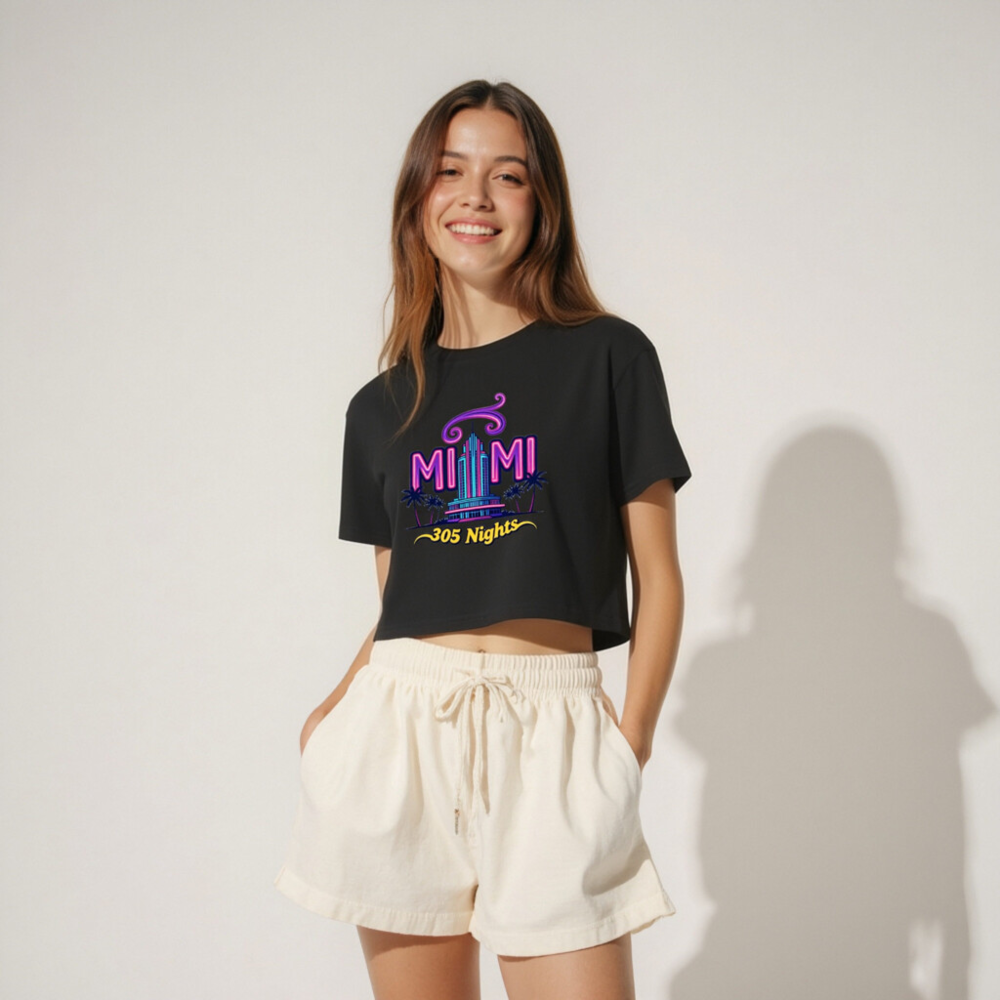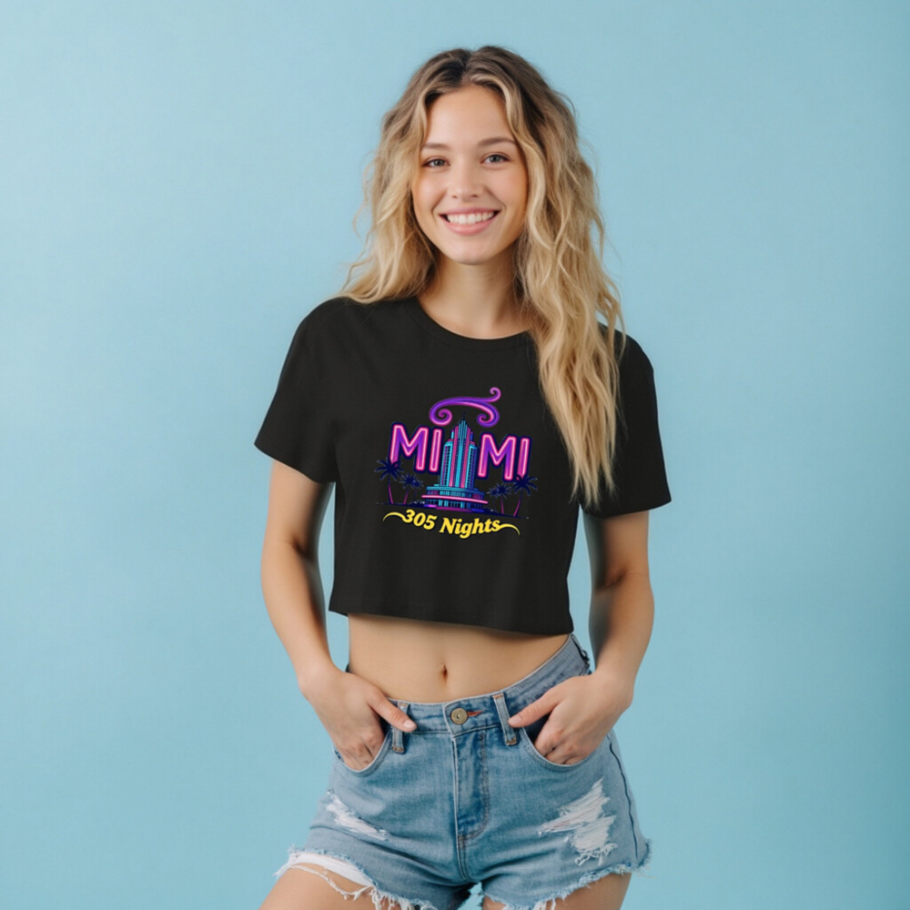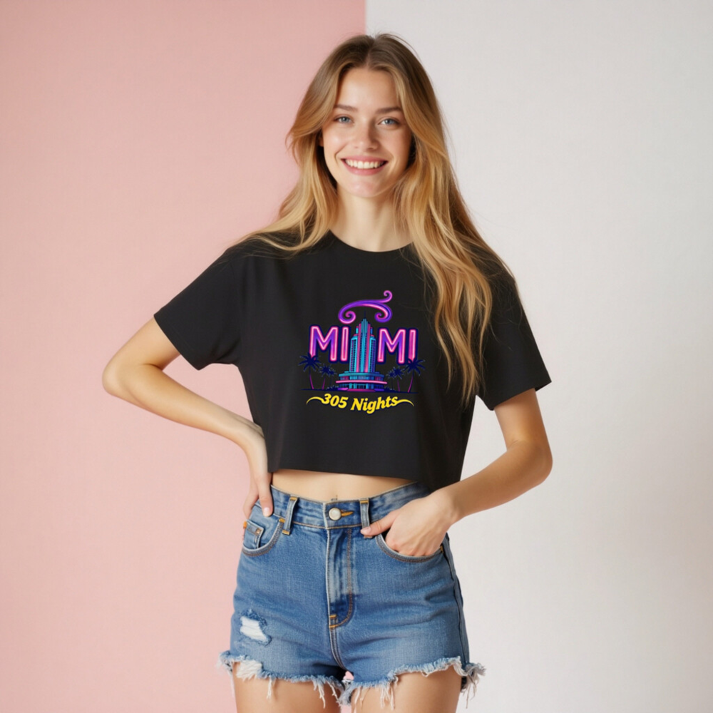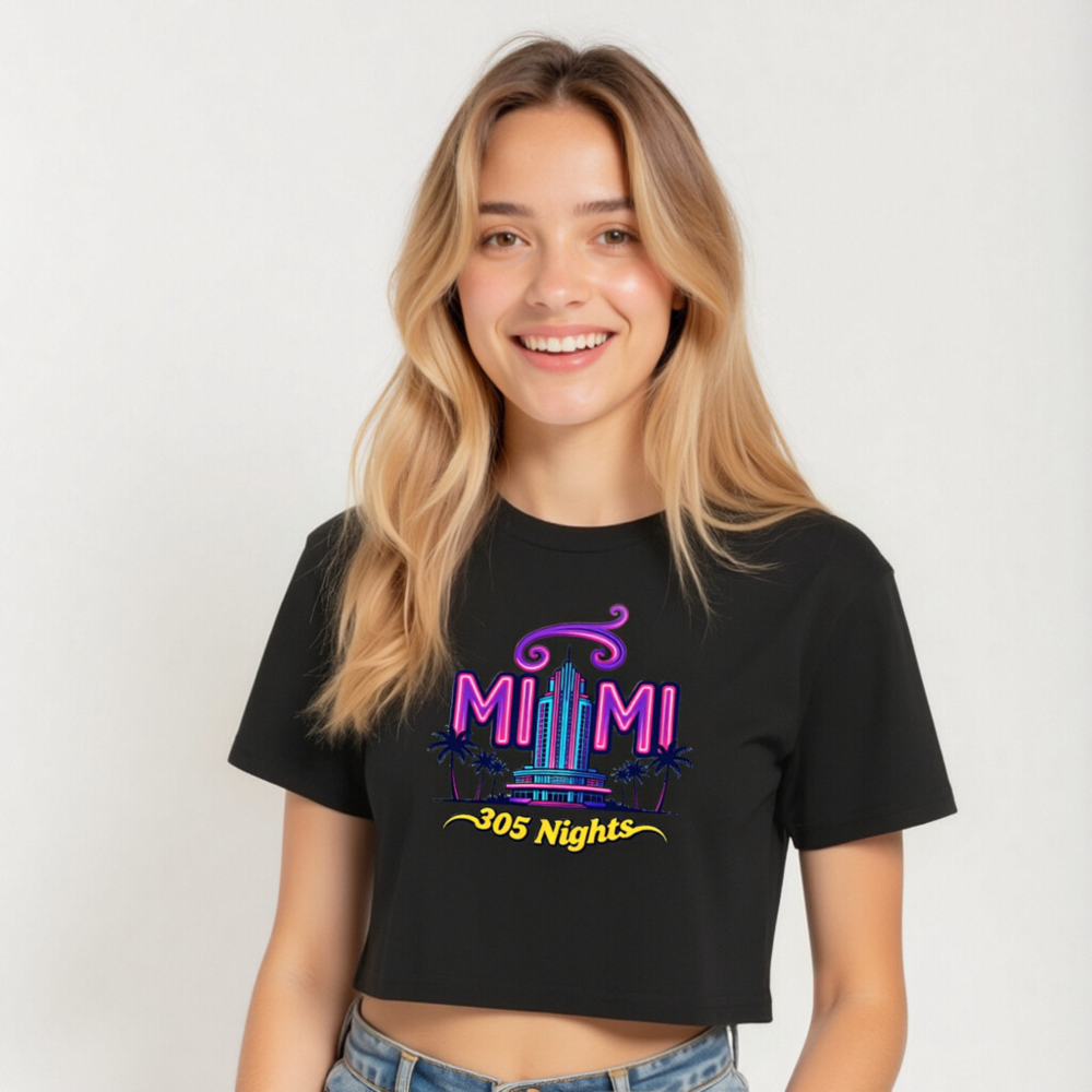 This women’s black crop top features vibrant Miami-themed neon art: ‘MIAMI’ in pink-purple glow with a turquoise Art Deco tower, palm trees, and ‘305 Nights’ in yellow script. Designed for casual wear, it’s a stylish tribute to Miami’s iconic nightlife and tropical vibe—perfect for fans of the city or 80s retro aesthetics.
