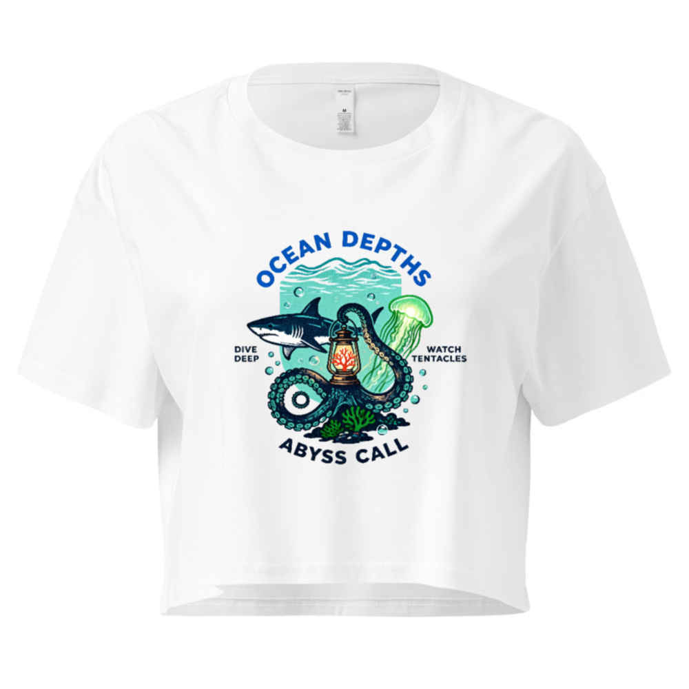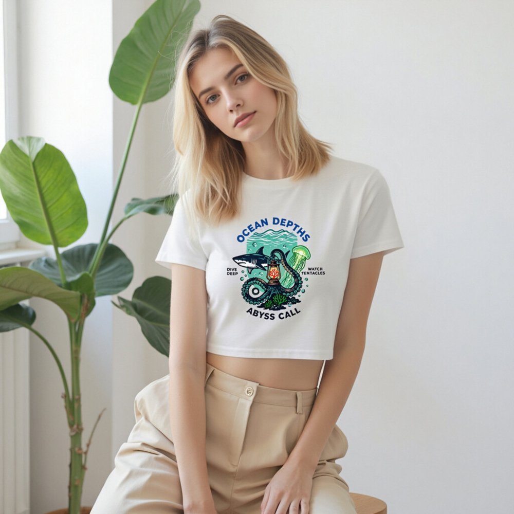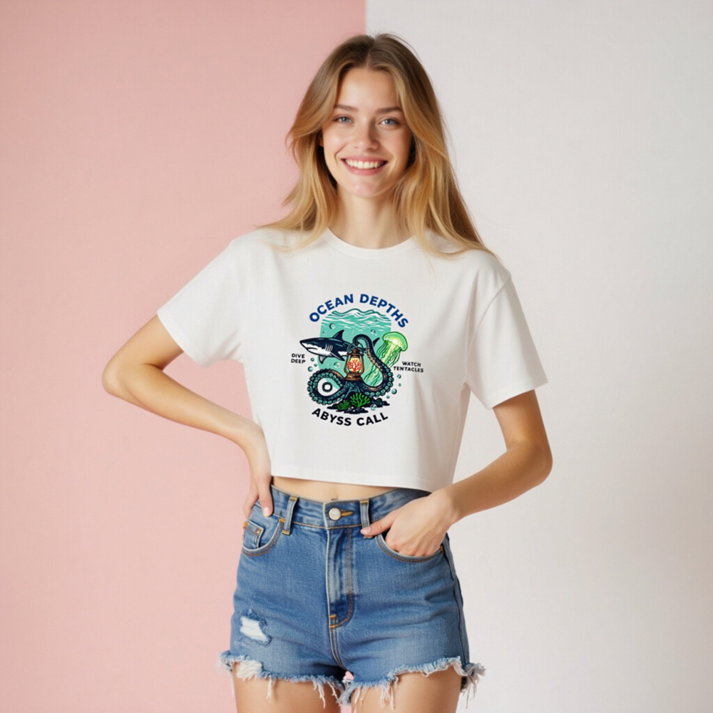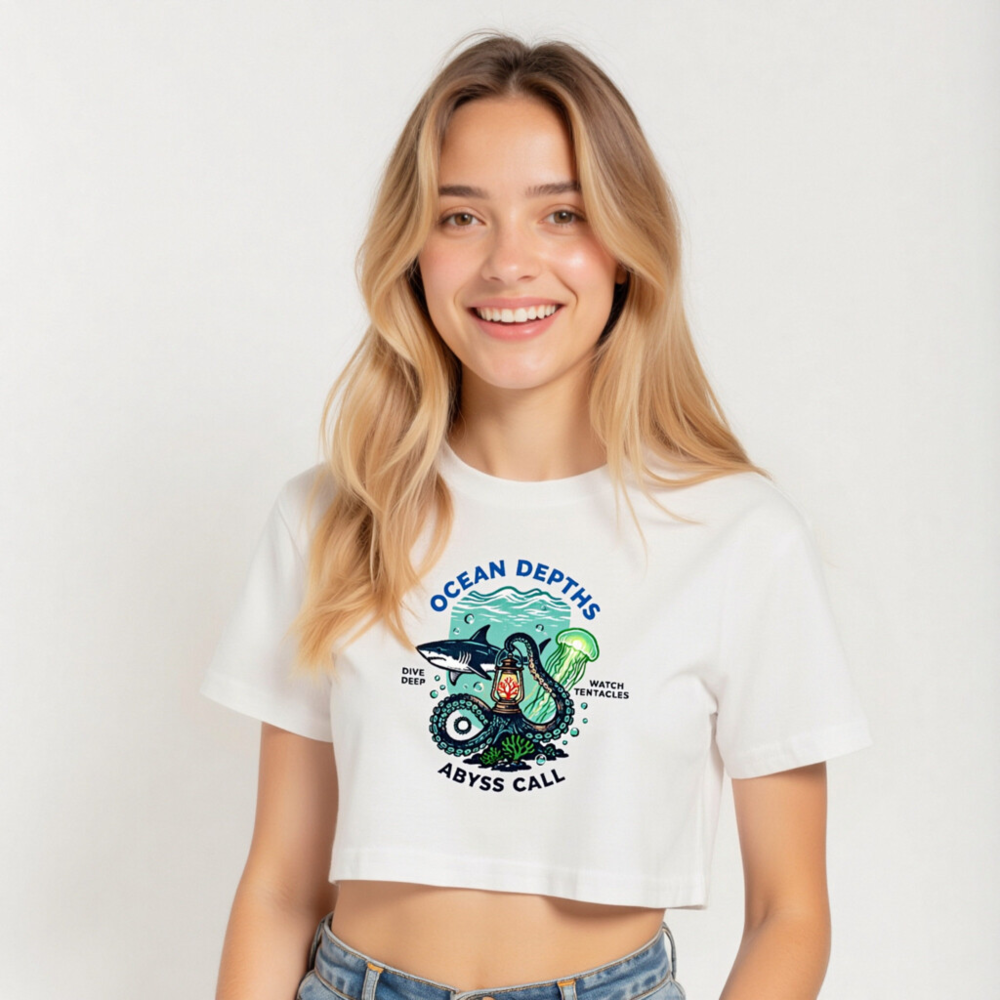 Discover our Women’s Ocean Depths Crop Top—featuring a vibrant underwater scene with shark, octopus, jellyfish, and coral. Bold ‘Dive Deep’ and ‘Watch Tentacles’ slogans add playful depth. Made for comfort and style, this cropped tee pairs perfectly with high-waisted bottoms. Ideal for ocean lovers, divers, and anyone who embraces the abyss. Premium cotton blend, machine washable.