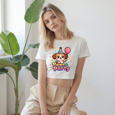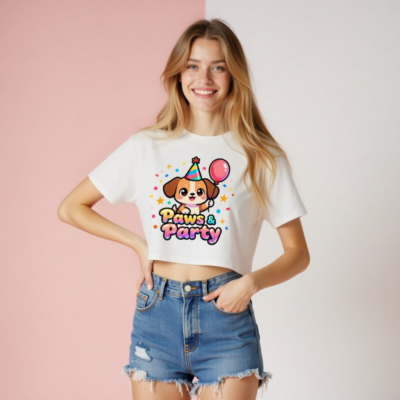 Adorable women’s crop top featuring a festive cartoon puppy wearing a party hat and holding a balloon, surrounded by confetti and stars. ‘Paws & Party’ text in colorful gradient font. Stylish, playful, and perfect for birthdays or pet lovers. Soft cotton blend, casual fit, ideal for everyday wear or themed parties.