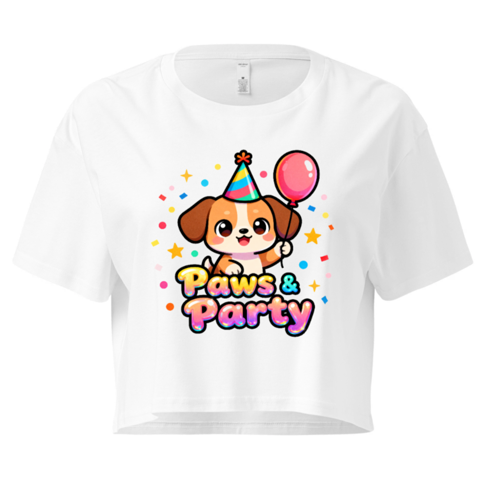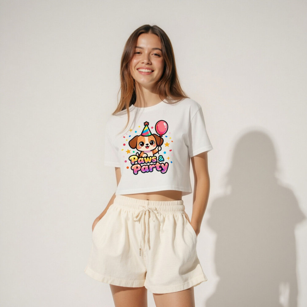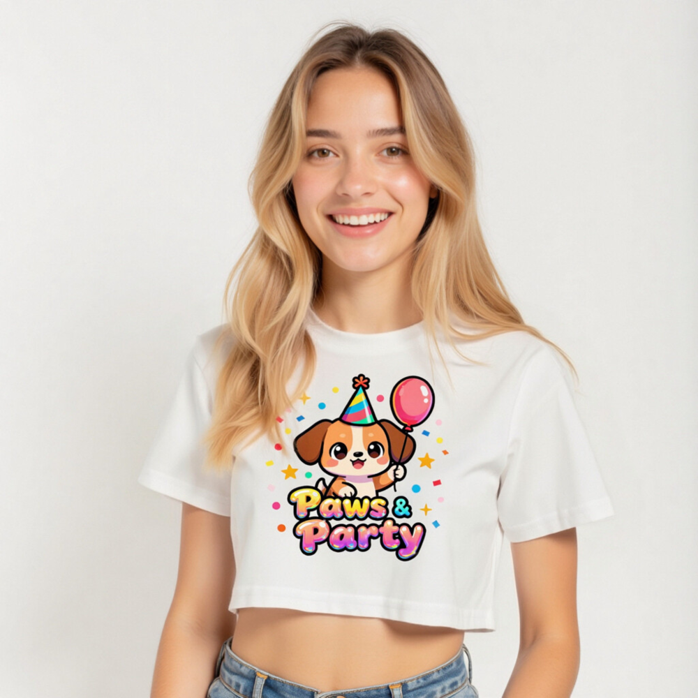 Adorable women’s crop top featuring a festive cartoon puppy wearing a party hat and holding a balloon, surrounded by confetti and stars. ‘Paws & Party’ text in colorful gradient font. Stylish, playful, and perfect for birthdays or pet lovers. Soft cotton blend, casual fit, ideal for everyday wear or themed parties.