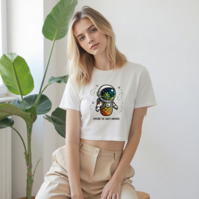 Adorable women’s crop top featuring a whimsical pineapple astronaut exploring space with forest & stars in helmet. Soft, comfortable cotton blend. Perfect for cosmic lovers and tropical vibes. ‘Explore the Sweet Universe’ slogan adds playful charm. Trendy, lightweight, and fun—ideal for casual wear or unique gift.