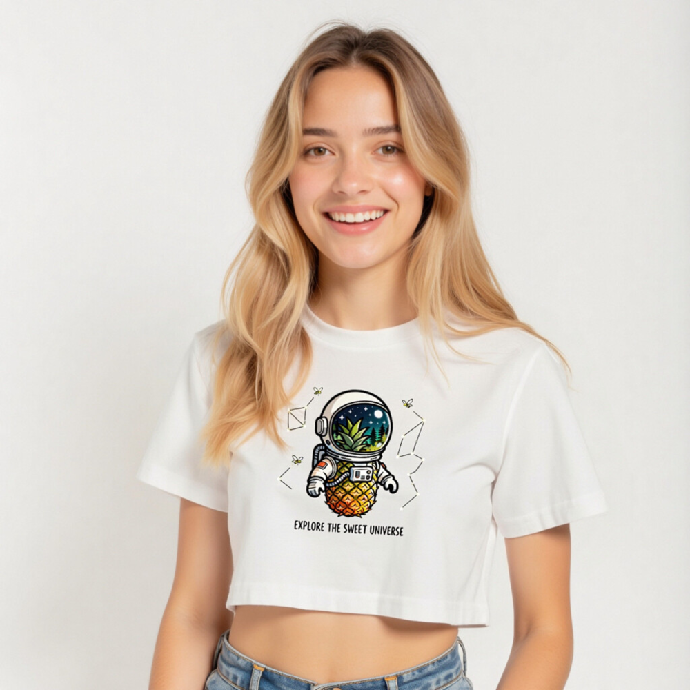 Adorable women’s crop top featuring a whimsical pineapple astronaut exploring space with forest & stars in helmet. Soft, comfortable cotton blend. Perfect for cosmic lovers and tropical vibes. ‘Explore the Sweet Universe’ slogan adds playful charm. Trendy, lightweight, and fun—ideal for casual wear or unique gift.